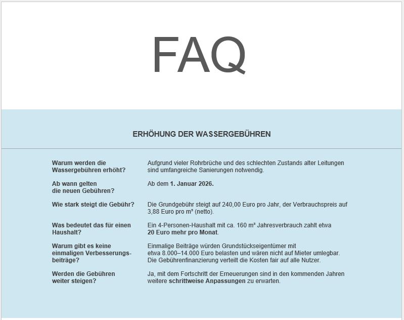 Angesichts der anstehenden Aufgaben ist diese Gebührenerhöhung als Investition in eine sichere, hygienisch einwandfreie und zukunftsfähige Trinkwasserversorgung zu verstehen. Die umfassenden Erneuerungen werden langfristig dazu beitragen, Reparaturaufwand und Rohrbrüche zu reduzieren und die Versorgungssicherheit dauerhaft zu stärken.